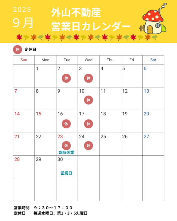 2025年9月の定休日は以下の通りとなります。