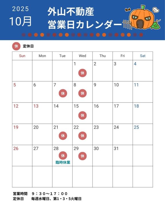 2025年10月の定休日は以下の通りとなります。